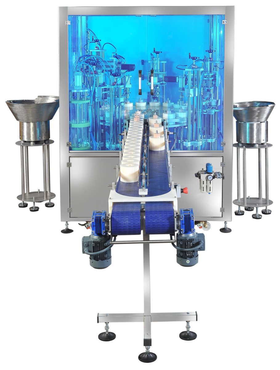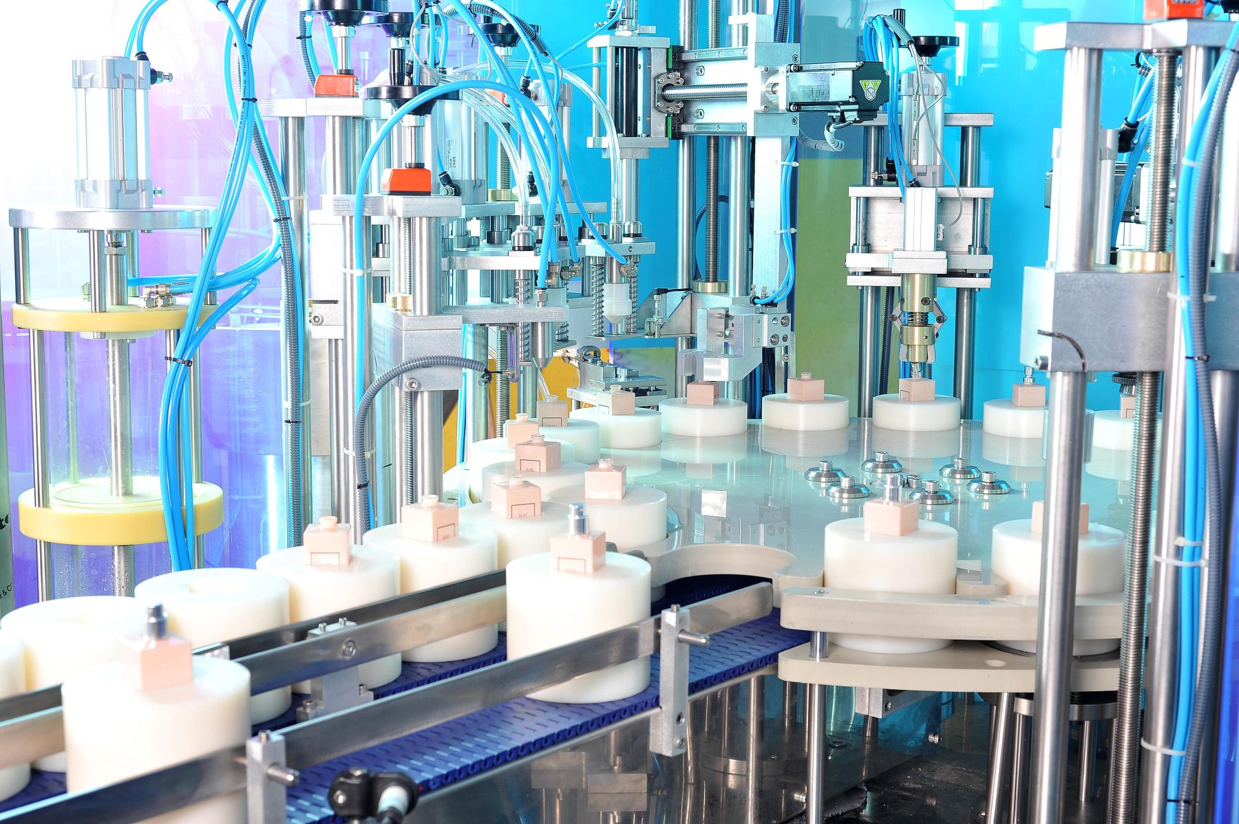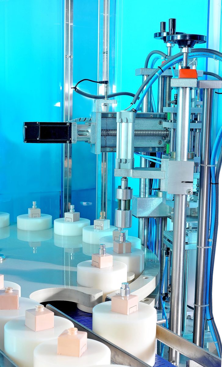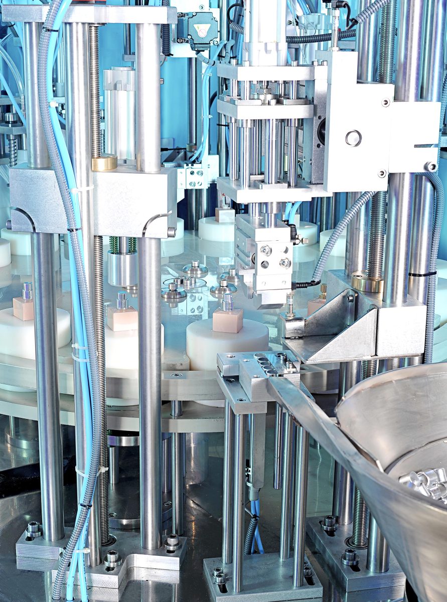 Dolum Ünitesi vakum pompası kullanarak seviye dolum yapmaktadır. Şişe dolumu bitince fazla sıvıyı basınç tahliye ünitesine ordan da tekrar tanka yönlendirilir. Vibrasyondan gelen Valf ve yüzükler şişelere yönlendirilir ve Valf ve yüzük yerleştirme, vidalı mil tahrikli Servo motor ile yapılır.