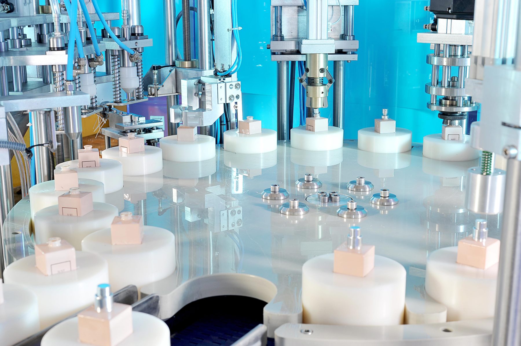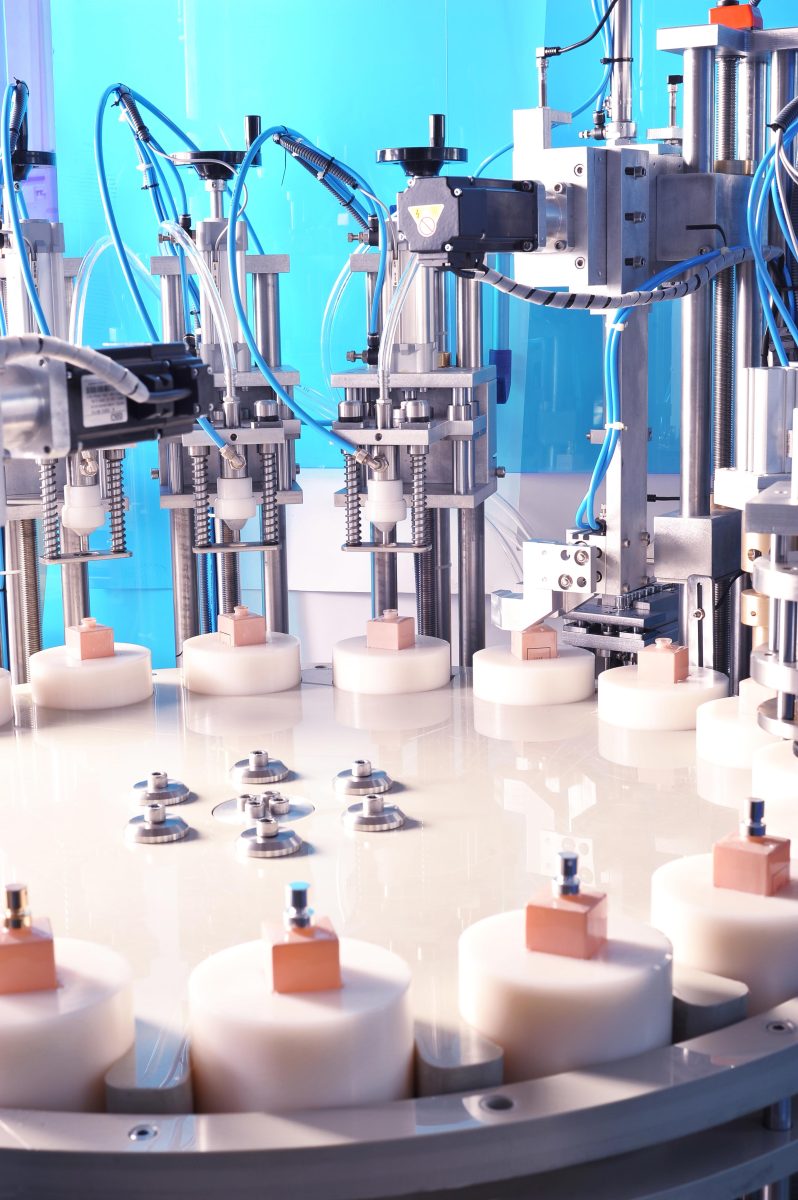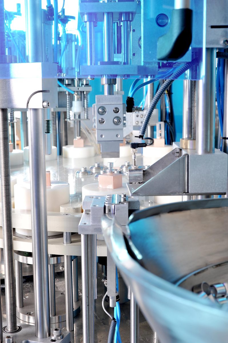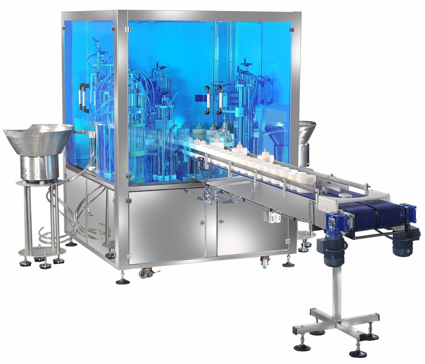 Dolum Ünitesi vakum pompası kullanarak seviye dolum yapmaktadır. Şişe dolumu bitince fazla sıvıyı basınç tahliye ünitesine ordan da tekrar tanka yönlendirilir. Vibrasyondan gelen Valf ve yüzükler şişelere yönlendirilir ve Valf ve yüzük yerleştirme, vidalı mil tahrikli Servo motor ile yapılır.