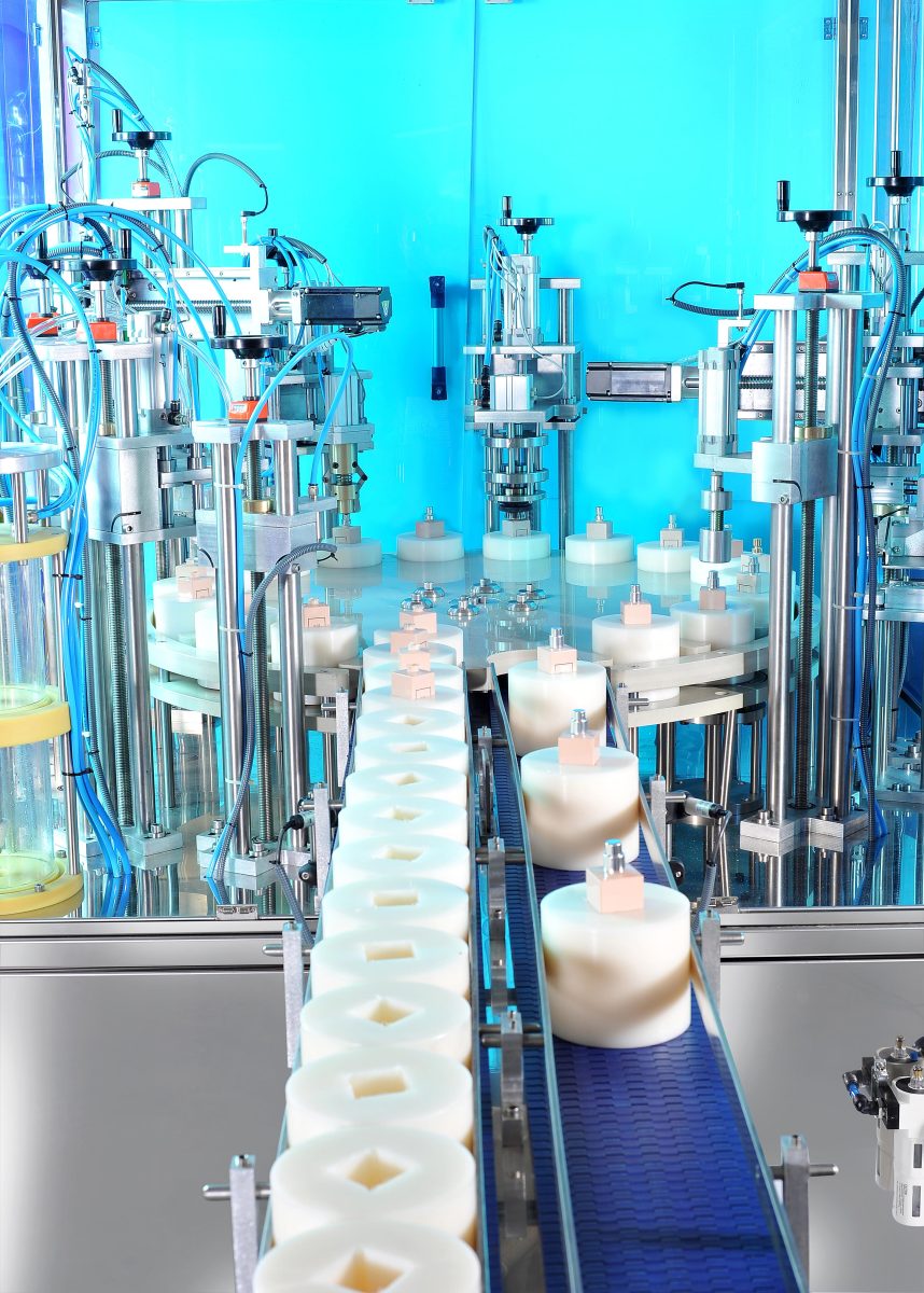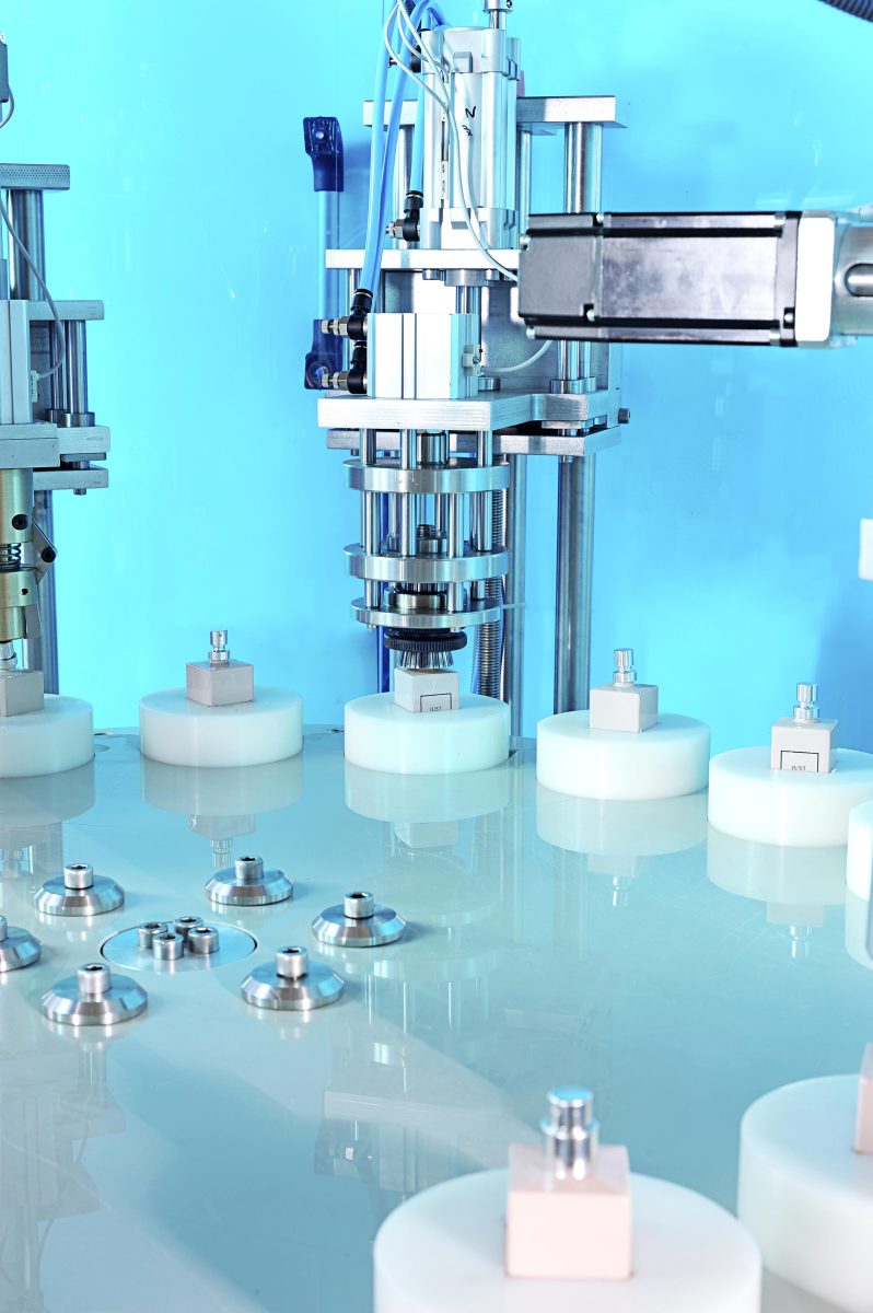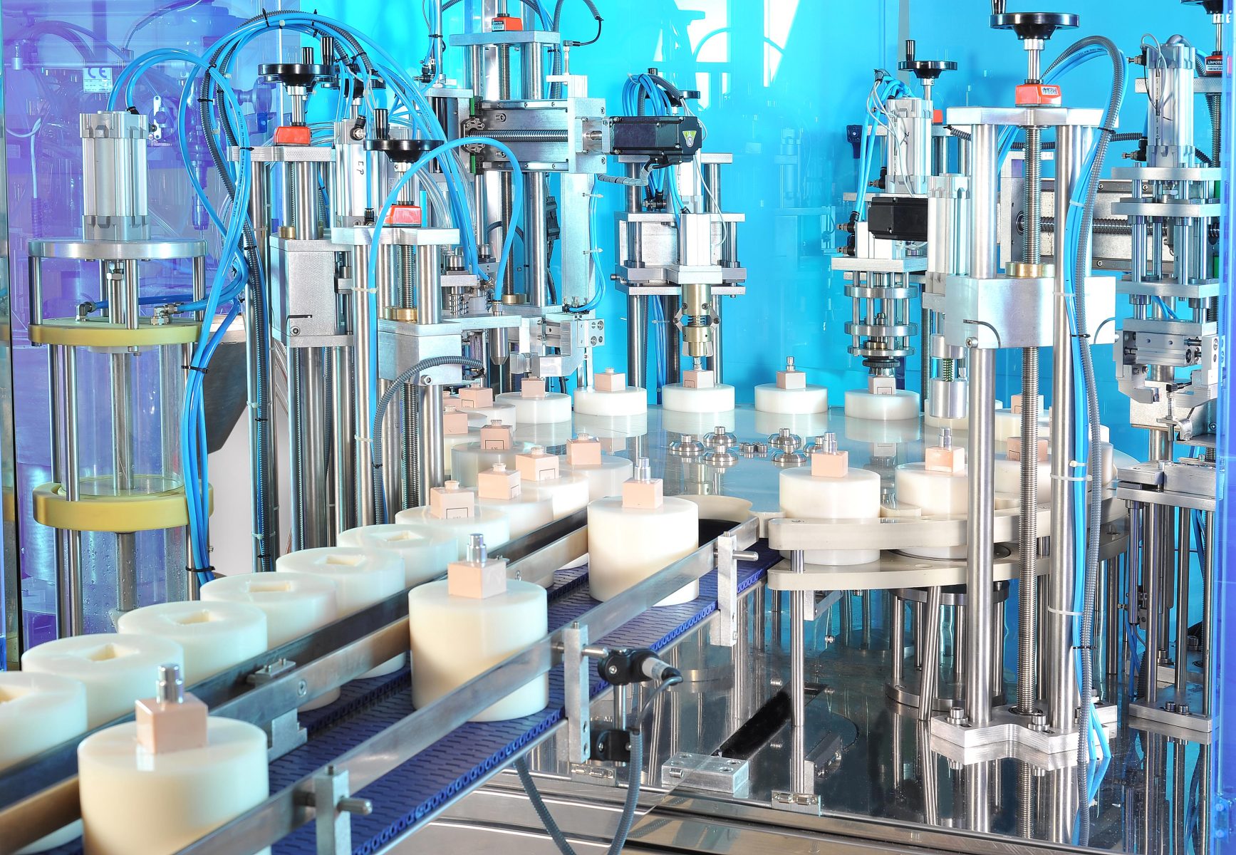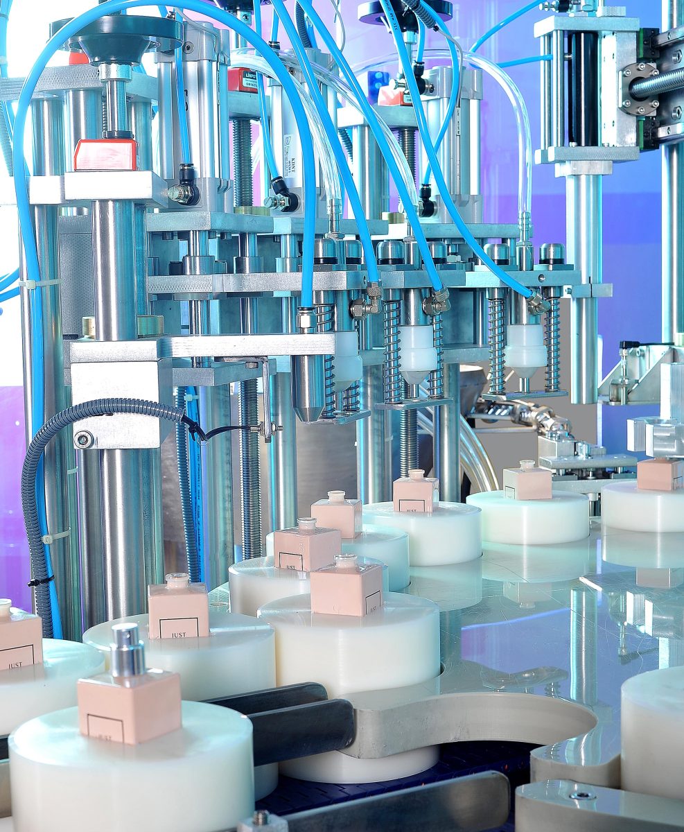 Otomatik parfüm dolum ve kapatma makinası 12 üniteden oluşmaktadır. Bunlar; şişe temizleme ünitesi, 3 adet dolum ünitesi, parfüm basınç tahliye ünitesi, valf besleme ünitesi, valf yerleştirme ünitesi, valf sıkıştırma ünitesi, valf pensleme ünitesi, yüzük besleme ünitesi, yüzük yerleştirme ünitesi ve yüzük takma ünitesi.